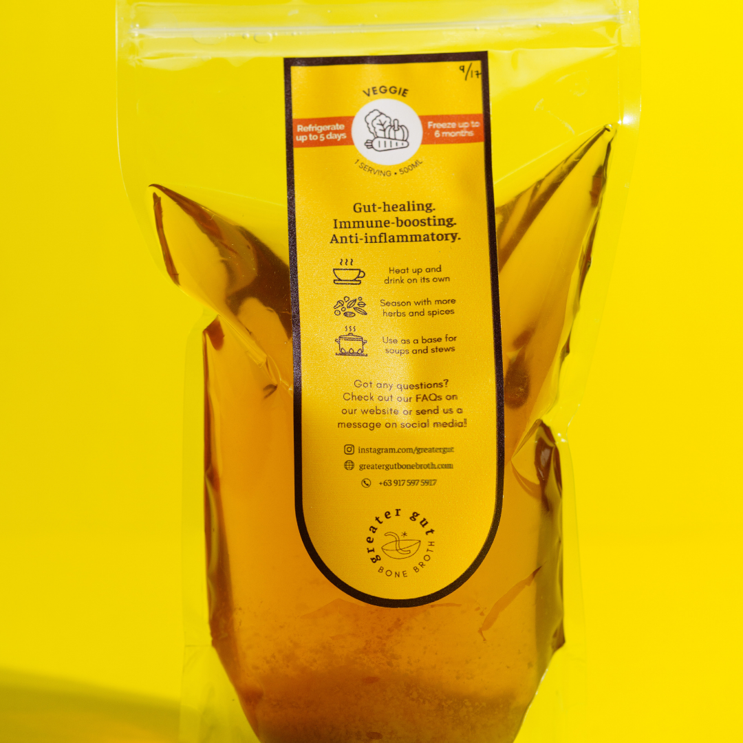 Our gut-healing veggie broth is made with choice vegetables, aromatic herbs, prebiotic shiitake mushrooms, fermented miso for probiotics, and turmeric to fight inflammation. 100% meat free. Can be consumed as a nourishing hot drink or used as a versatile base for soups, stews, and other dishes! You can also supercharge your broth with our add-ons: Turmeric & Cayenne Spice Pack and MCT Oil.